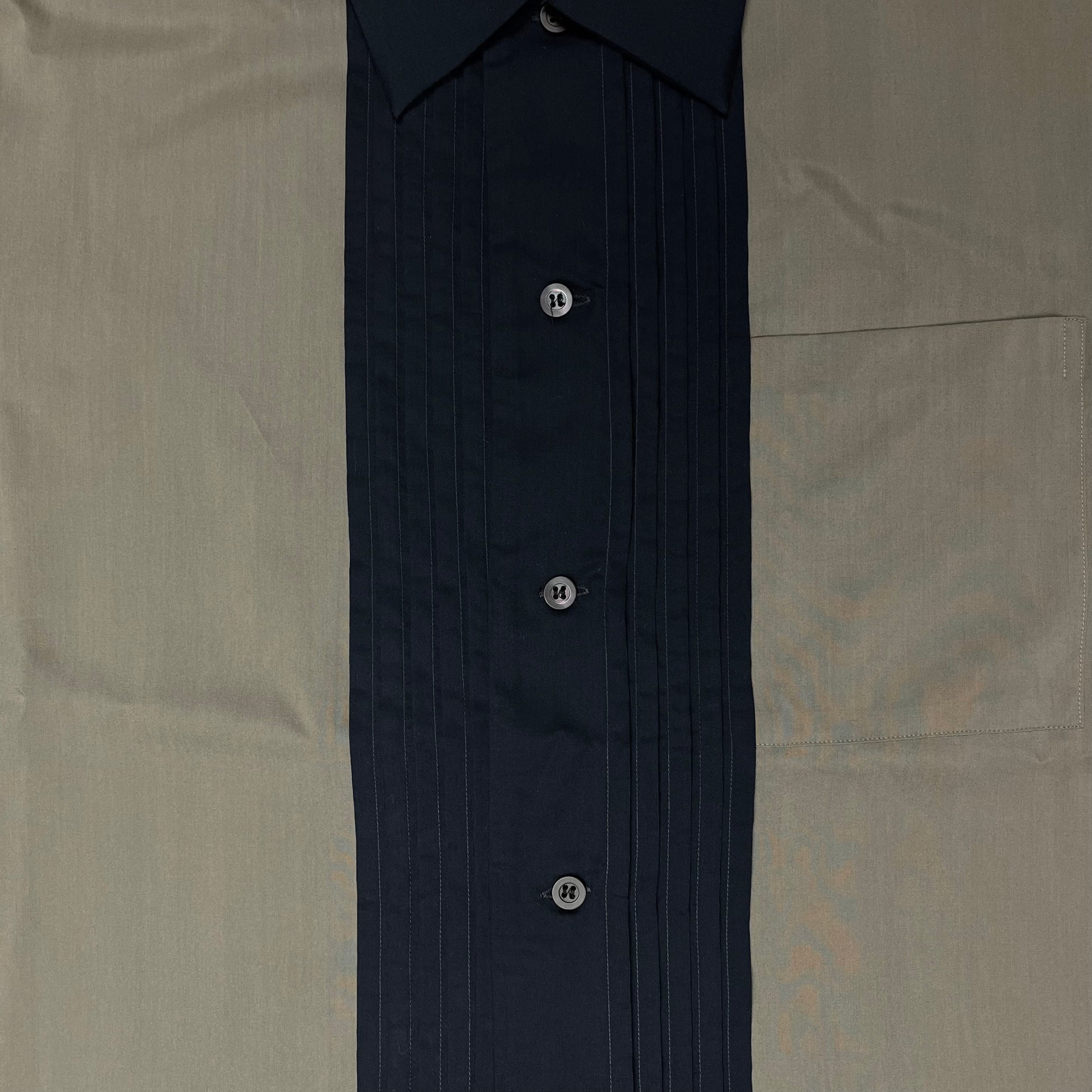 Simple short sleeve shirt from Dries Van Noten’s Spring Summer 2020 collection. Beautiful khaki green colorway with a pleated black contrasting design element running down the front around the button closure. Chest pocket at the right side. Boxy cut. Purchased at the Antwerp Sample Sale. Retailed for around 400€.