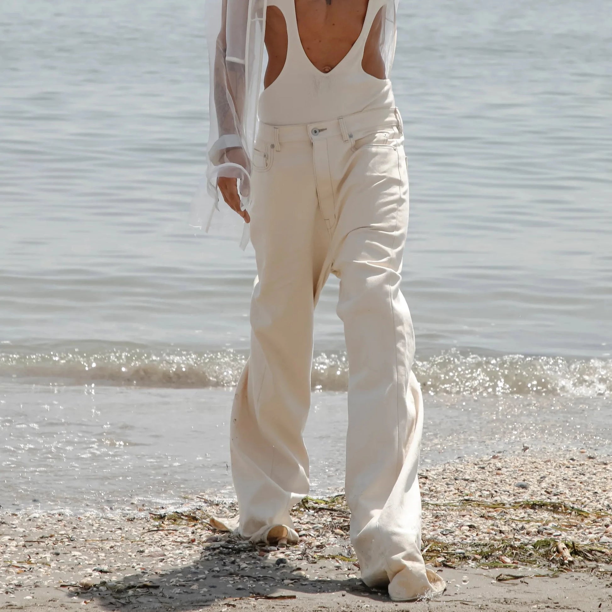 Cream cotton pants from the recent Rick Owens DRKSHDW collection. Featured on the opening runway look. Iconic bolan cut with a tremendous flare and really long inseam which creates a really nice silhouette. Subtle contrast stitching at the fly. Internal black strap with an embroidered logo. Retailed for around 550€