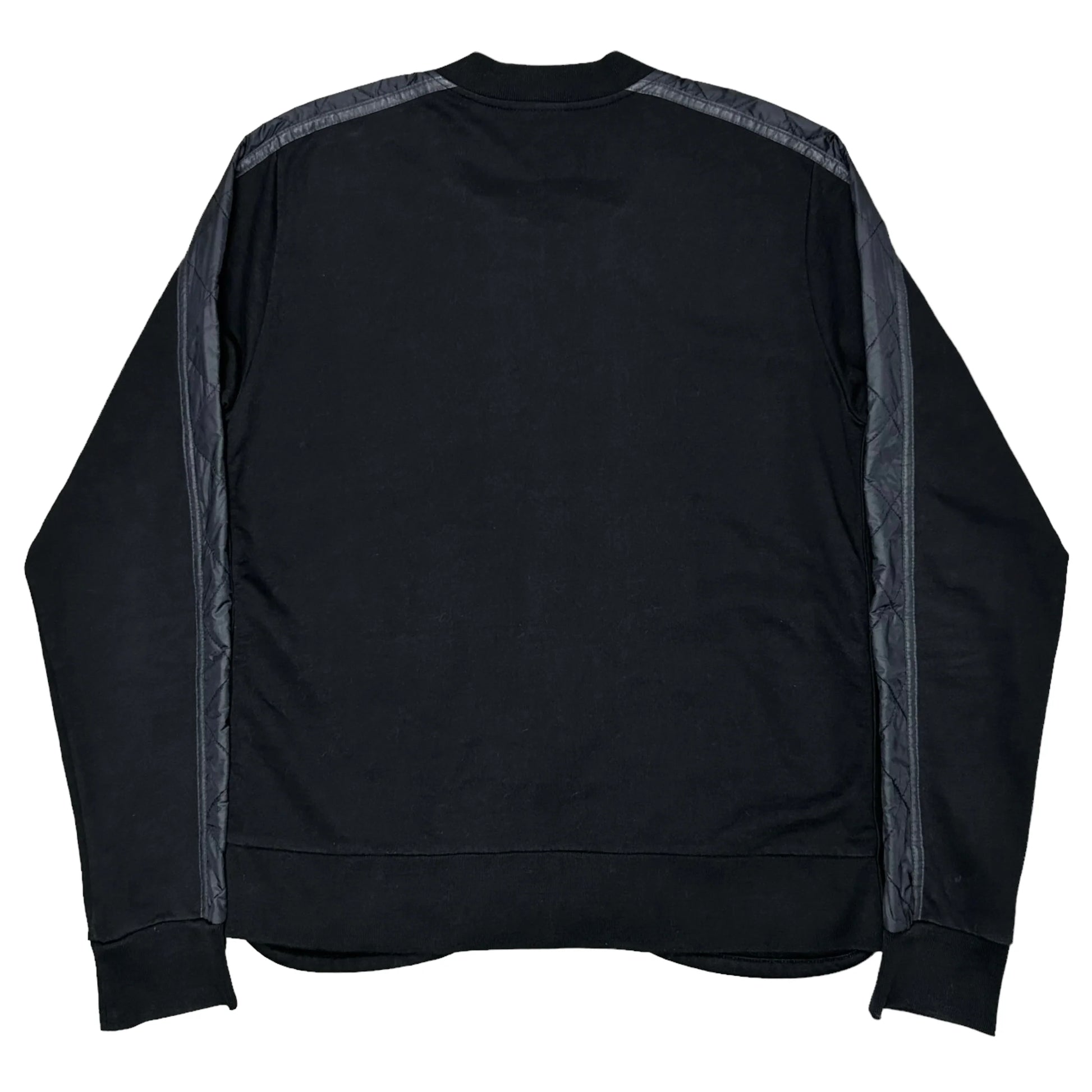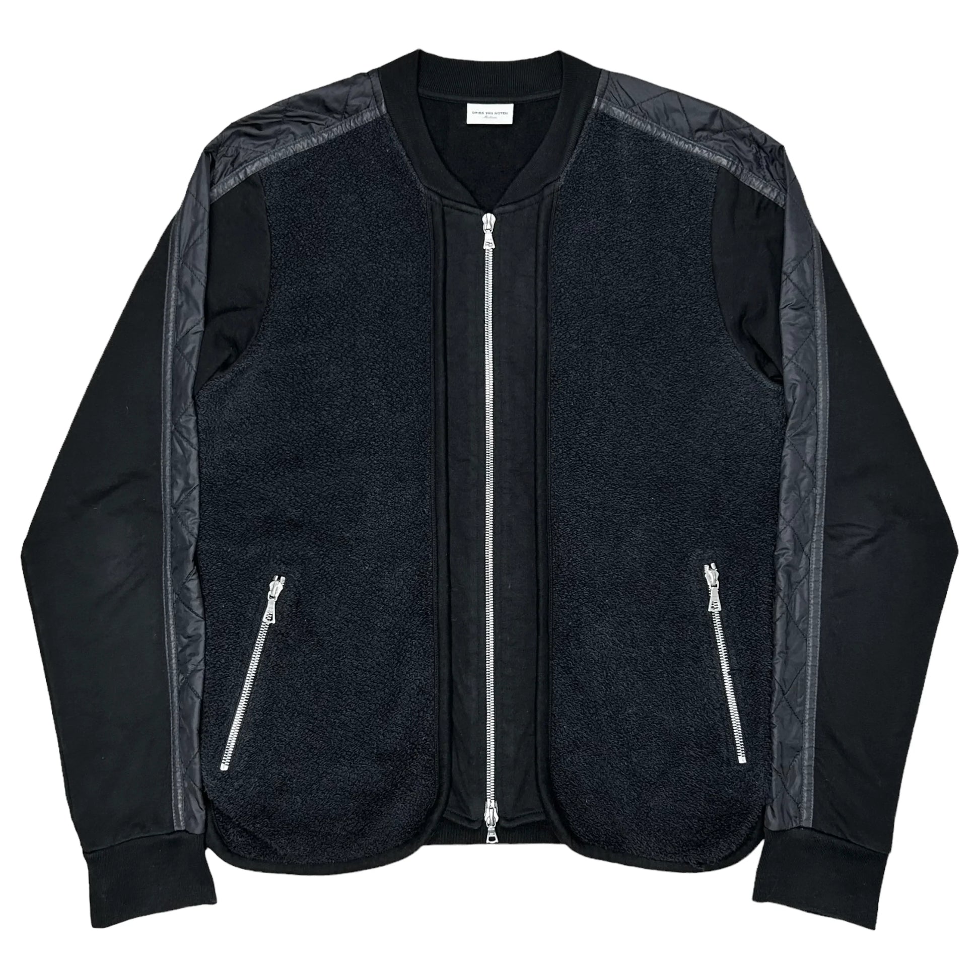 Black bomber jacket from Dries Van Noten. Made from cotton, polyester and polyamide. Silver Riri zip closure at the front with further zippers at the pockets. Made from different textures including a fleece part at the front, quilted application at the sleeves and regular sweat material. Relaxed cut with a short body. Retailed for around 600€.