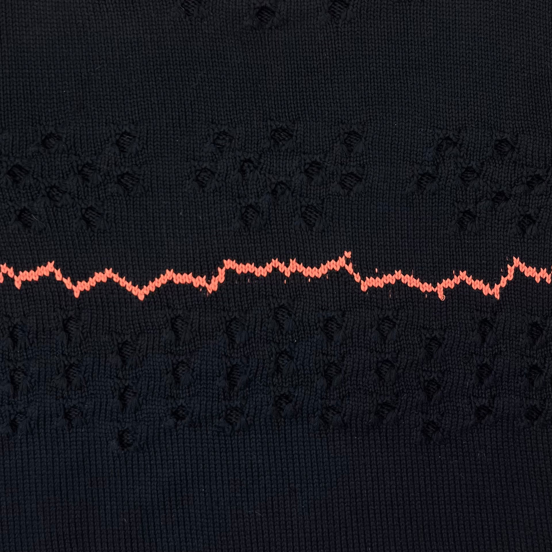 Black knitted crewneck jumper from the spring summer 2021 Krokus collection. Multiple cut-out details at the chest and around the neck which creates a really nice look, especially when layered with a white shirt. Orange intarsia detail at the back and front center of the sweater. Thick collar in a contrasting purple. Relaxed cut with a slightly shorter body. Retailed for around 600€.