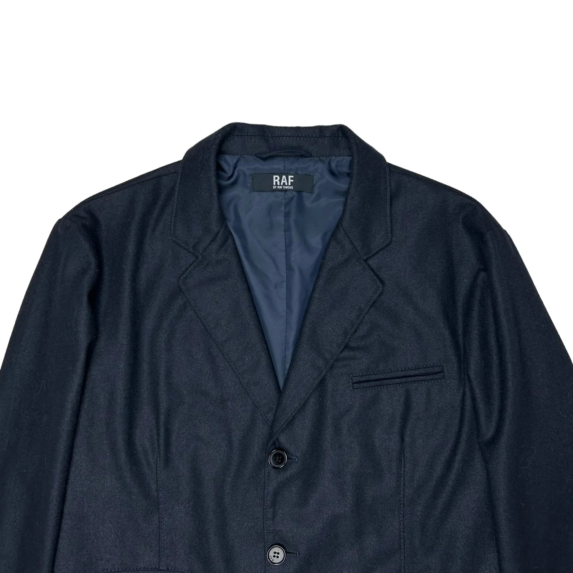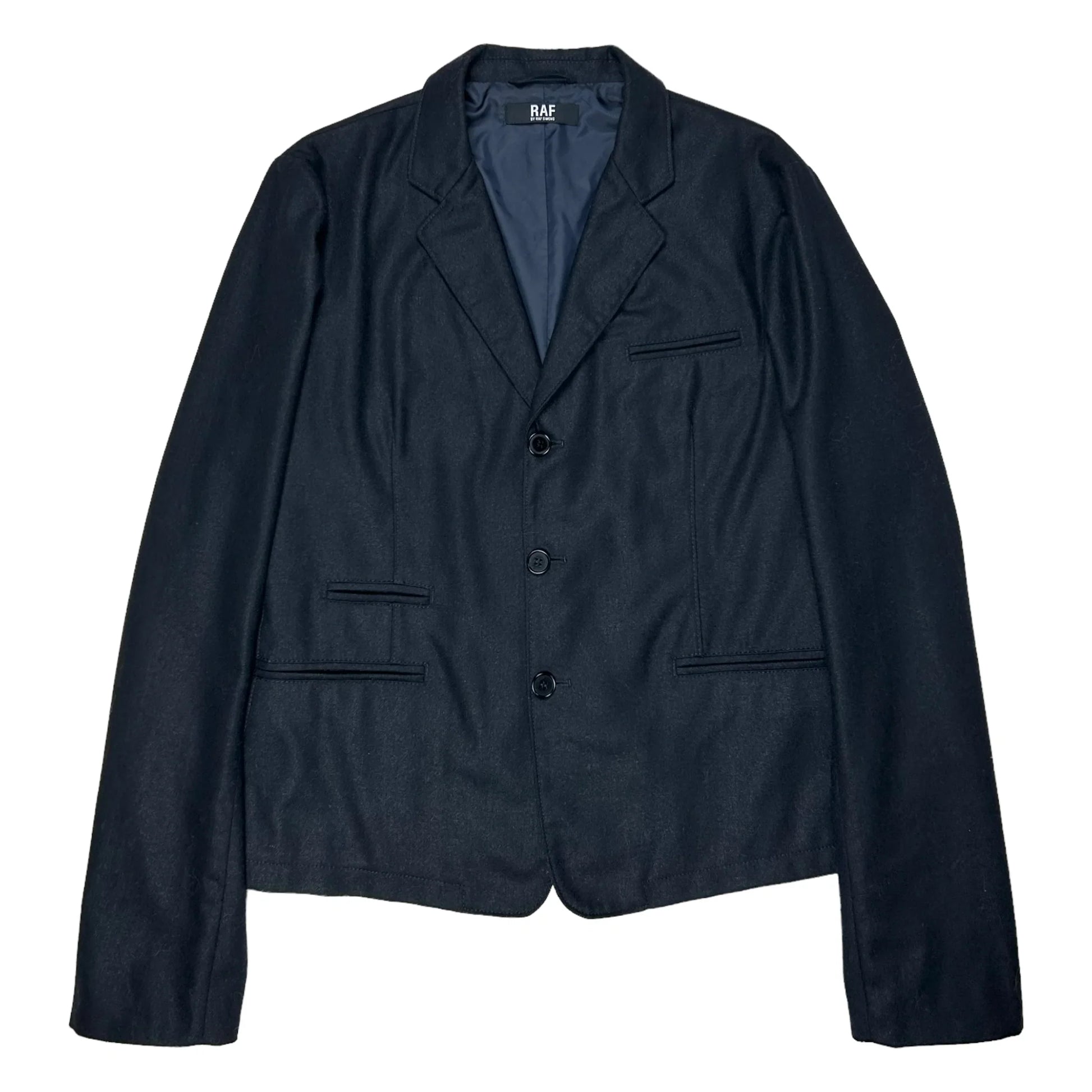 Dark navy blazer jacket from Raf by Raf Simons which is the infamous and cancelled diffusion line. 4 Slid pockets at the fronts which are arranged in a unique and interesting manner. Tonal button closure. Made from a soft wool blend. Boxy and short cut with elongated sleeves.